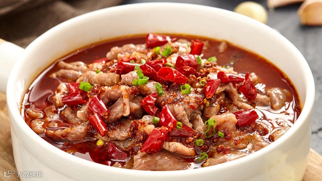 水煮牛肉由四川自贡名厨范吉安创制,以牛肉片为主料,菜薹或莴笋、红白萝卜为辅料,成菜白、红、绿、黄四色相映,牛肉鲜嫩,色深味厚,香味浓烈,突出了川菜麻、辣、烫的独特风味。