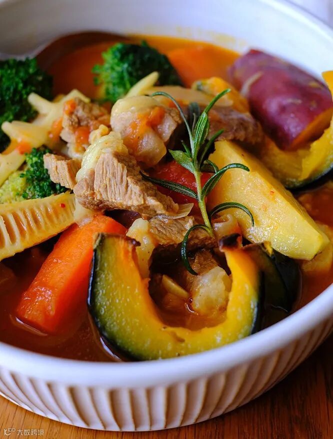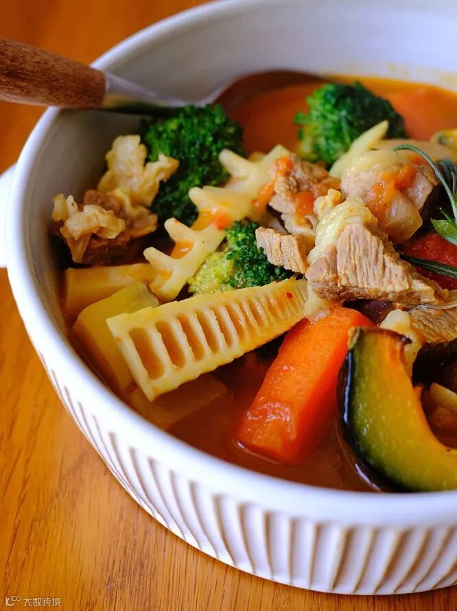 非常浓稠的汤汁,大块的丰富多彩的蔬菜,赏心悦目啊。