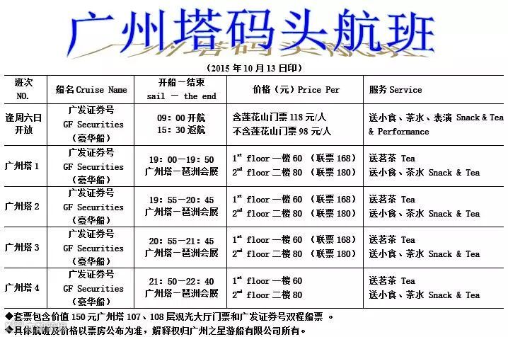 服务:双程游江、送茶水、小食(含莲花山门票、表演、导游讲解)