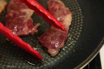 大火烧热后转中火,牛排下锅,用不了几秒钟,就能看到热腾腾的牛油从肉里一汪一汪地往外涌,一面煎约30秒后,用牛排夹或筷子挑起肉的一头看看底面,色泽微微焦黄就可翻面啦。