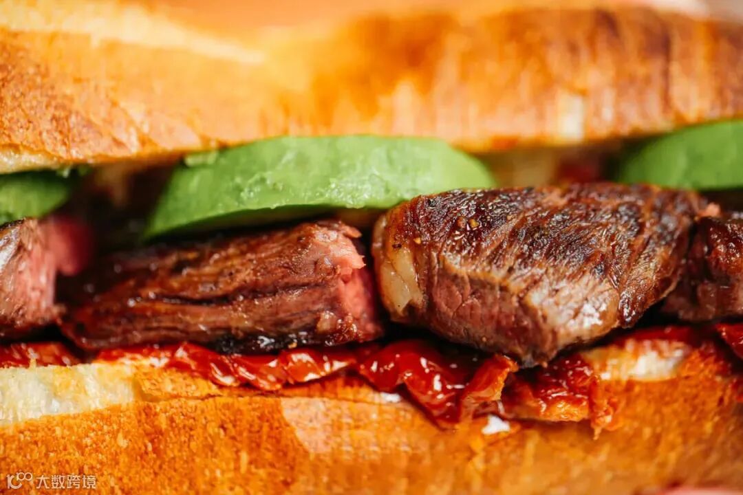 此时再来将牛排切成小块,法棍横着切开(不要切到底),内侧涂满黑胡椒蛋黄酱,再按照培根→干番茄→牛肉块→酸黄瓜→牛油果的顺序夹进去。