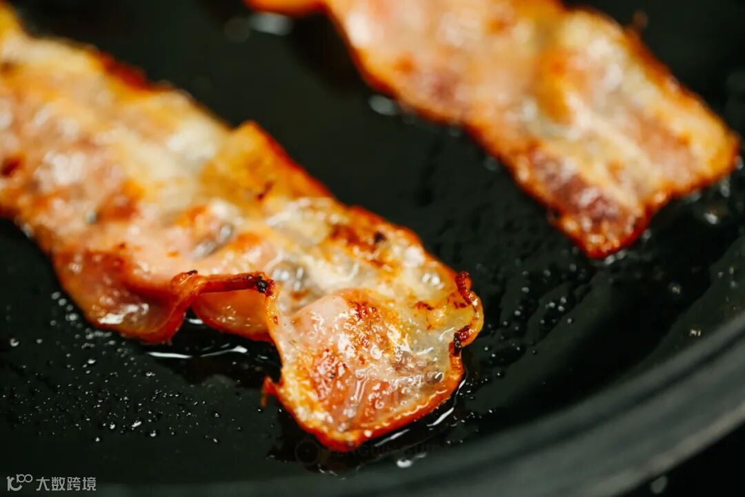 大火热锅,铺入培根。培根煎至金黄微焦、油脂大部分被逼出,略焦脆的状态,即可出锅,放在一旁备用。