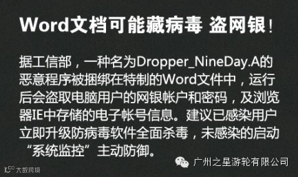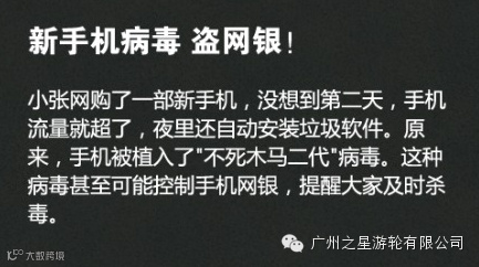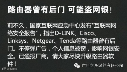 天字码头珠江夜游①二维码可能有病毒,别随便扫 ②工行"95588"短信可能是骗子伪装的 ③病毒能控制手机网银 ④骗子在商场建免费WIFI盗密码 ⑤可能仍有网站存"心脏出血"漏洞 ⑥部分路由器留有后门 ⑦支付页面前缀是http,可能有假 ⑧Word文档中也会有黑手……转起防骗!