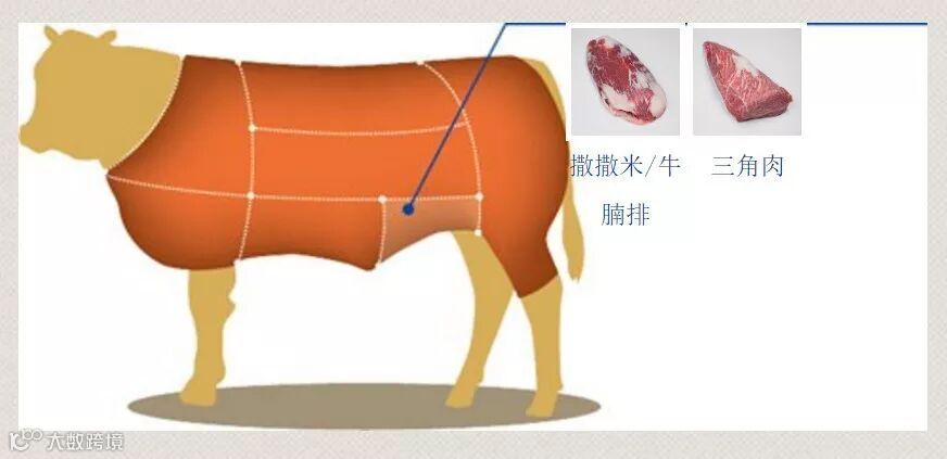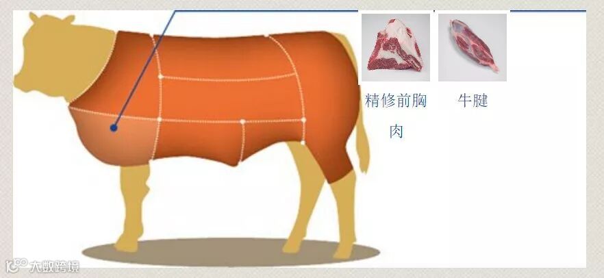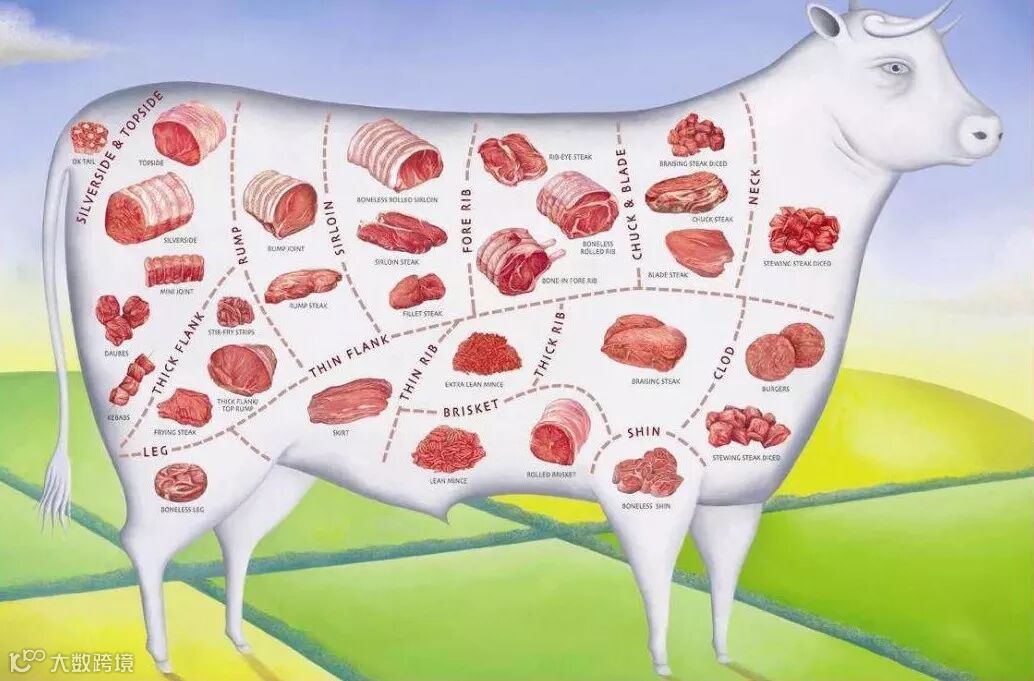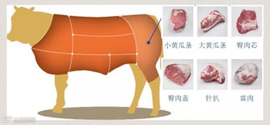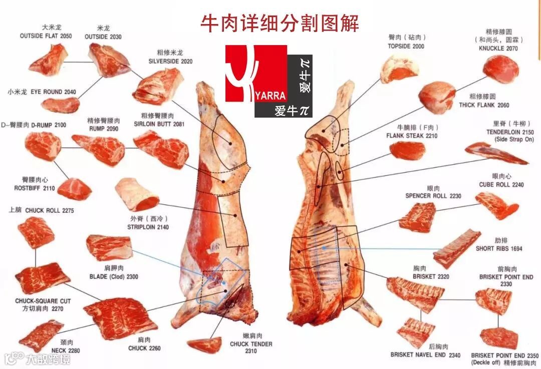 这个划分标准为澳洲畜牧协会及澳洲肉类规格管理局颁发的国际红肉手册,澳洲牛肉按照这个标准来划分的,他们出厂的时候标签就是按照这个标准贴标的。这个标准划分对于一般人来说比较复杂,将一头牛去骨去内脏后的牛肉划分为60个左右的部位。