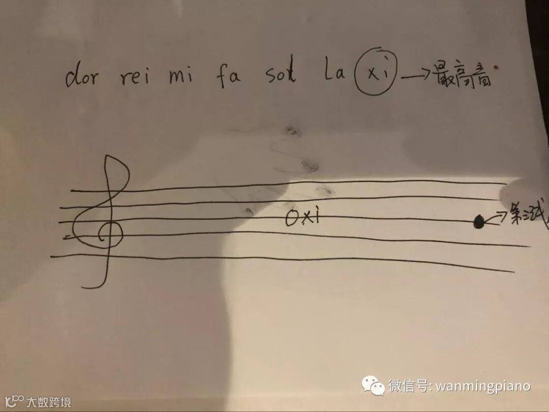 第四步:第三指对应五线谱就是第三线,所以高音谱号,第三线上的音高就是xi