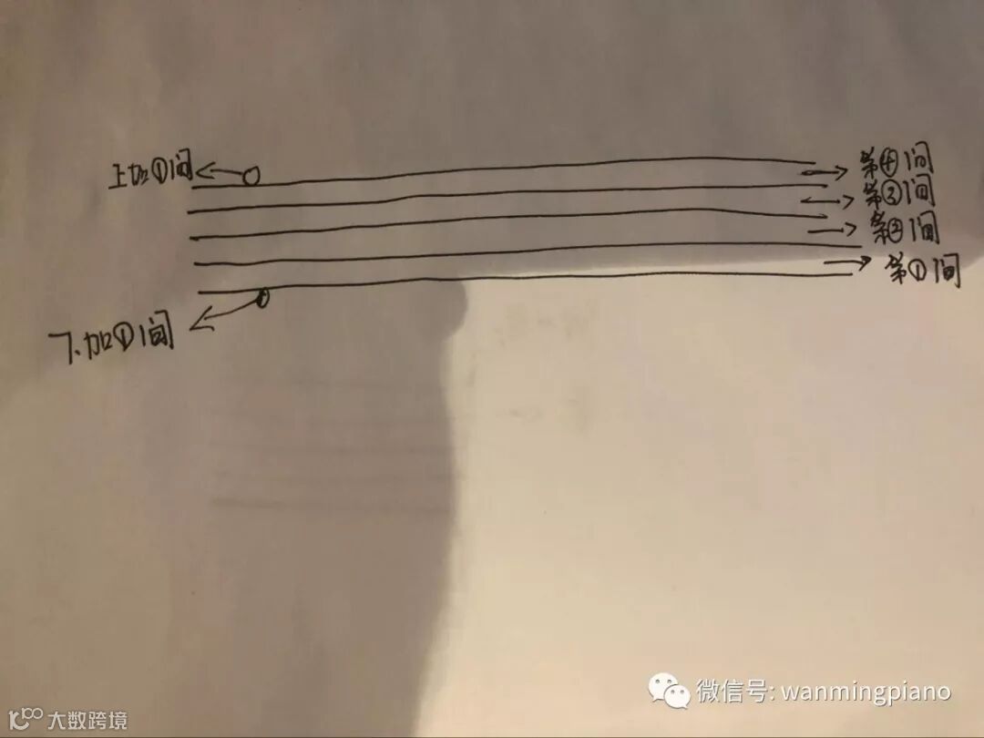 两条线之间的空白就叫间,五线谱从下往上一共有四个房间。往上加一个房间叫上加一间,往下加一个房间叫下加一间