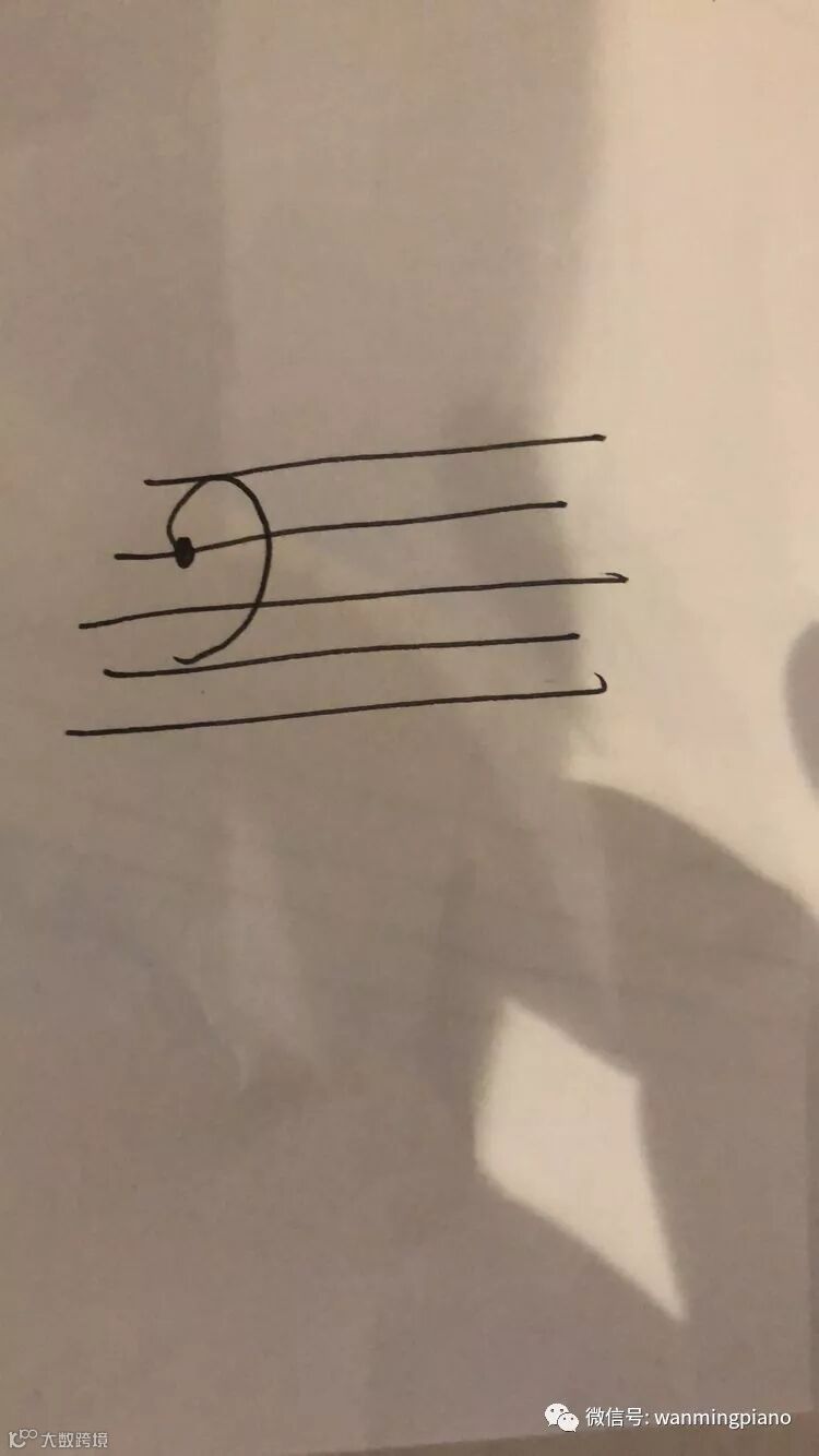 (1)看图前,先了解下中央dor在高音谱上的什么位置,中央dor在高音谱号无线谱的下加一线上(下面加了一条小短线),我们可以看到下加一线上,有个音符是被下加一线从中间穿过去的。