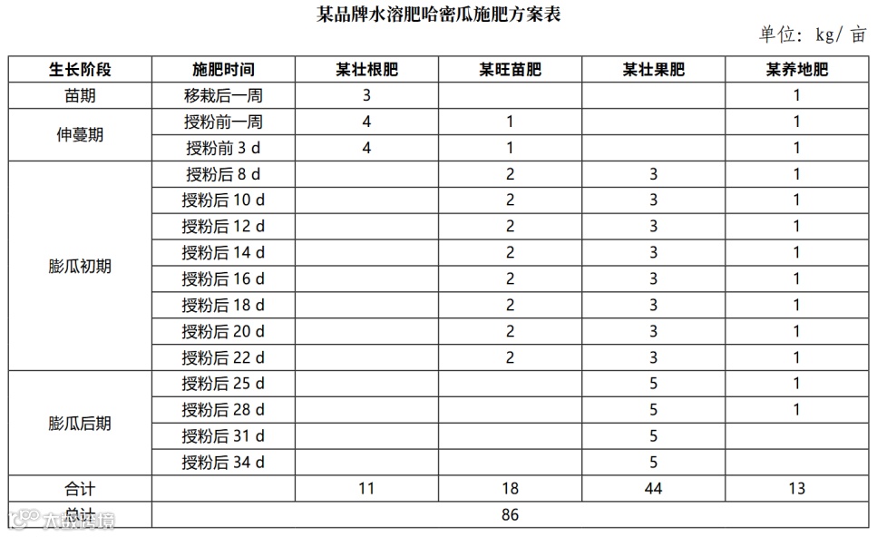 基本不用测量EC值和pH值,这和纯水培有很大的不同。水培栽植,肥液可以回收再次利用,因此,需要关注测量肥液流出口的EC值和pH值,根据测量出来的数值再增添肥料和调整pH值。以下是某品牌肥料推荐的哈密瓜施肥方法: