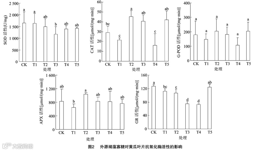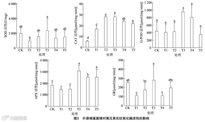 由图3可知,与对照组(CK)相比,褐藻寡糖处理使黄瓜果实中的SOD、CAT、APX、POD及GR的活性发生变化。