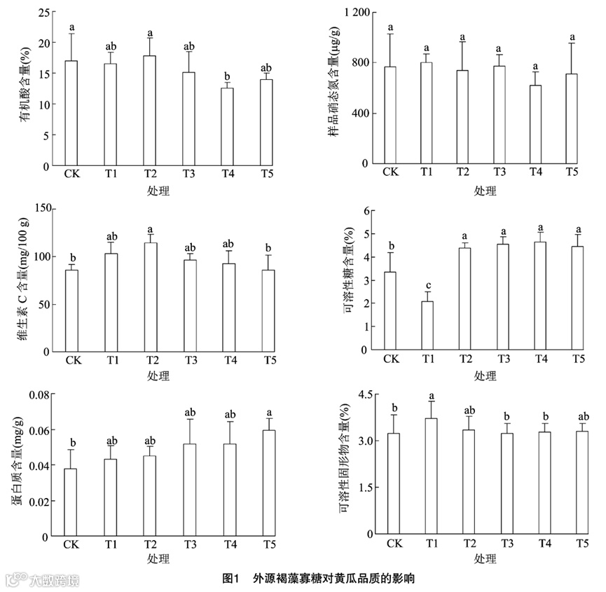 平均单果质量分别较CK组提高了0.48%、3.21%、10.59%、12.41%和12.35%。由此可知,外源褐藻寡糖的添加可明显增加黄瓜的产量,且高浓度的褐藻寡糖具有更明显的增产效果。