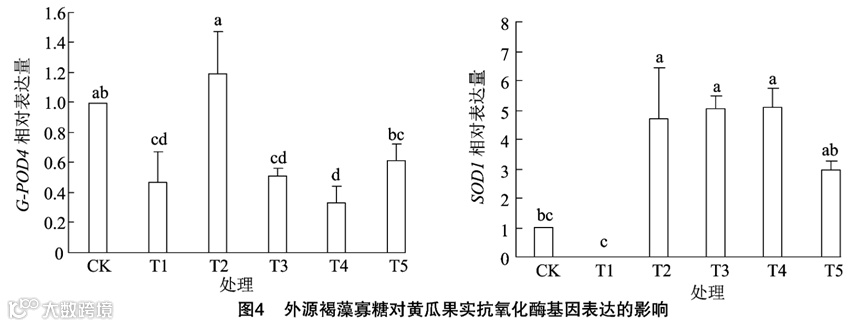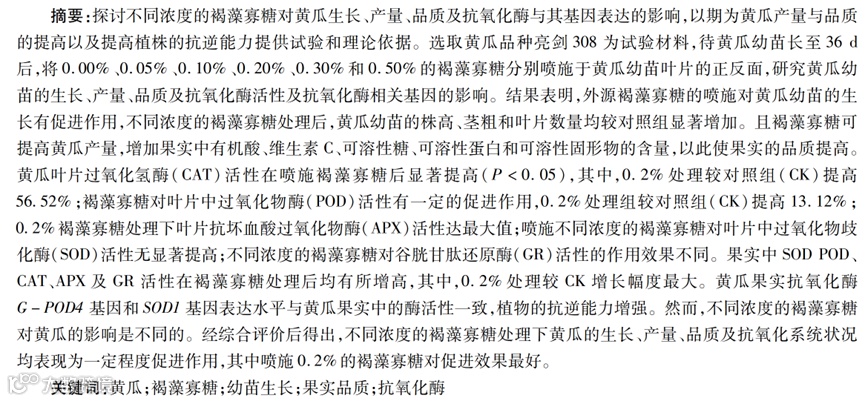 本研究以黄瓜为试验材料,褐藻寡糖促进黄瓜植株生长、增加黄瓜果实产量、提升果实营养品质,同时提高黄瓜叶片及果实中的抗氧化酶含量,果实中抗氧化酶基因表达上调,使植物潜在的抗逆能力增强。