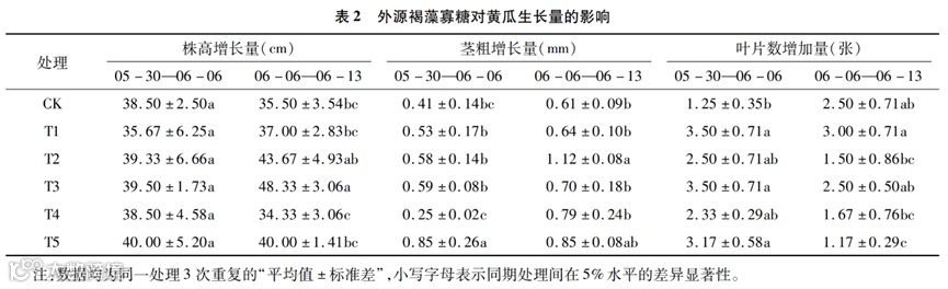 在株高方面,0.2% 浓度(T3)处理下,黄瓜株高增长量达到 48.33cm,相比对照组显著提升 36.14%;茎粗方面,除 T4 处理略有下降但未达显著水平外,其余处理均有不同程度提升,T5 处理第一周茎粗增长量显著提升 107.32%,T2 处理第二周提升 83.61%;