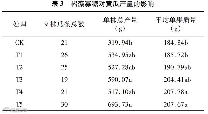 由表3可知,经褐藻寡糖处理的黄瓜植株的产量与对照组(CK)相比显著增高。T1、T2、T3、T4和T5处理组的黄瓜单株总产量较CK组分别提高了67.20%、64.81%、84.43%、61.62%和116.83%。