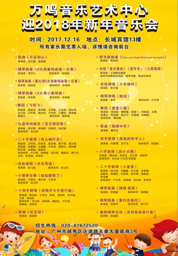 万鸣音乐艺术中心开设课程有:钢琴、小提琴、吉他、尤克里里、声乐、流行演唱、乐理、小组唱、万鸣·小海鸥合唱团、视唱练耳。2018年预备开设课程:舞蹈、播音主持、竖笛演奏班、民乐团、美术班等集体课程。咨询热心:020-87672520、87654669.周老师。