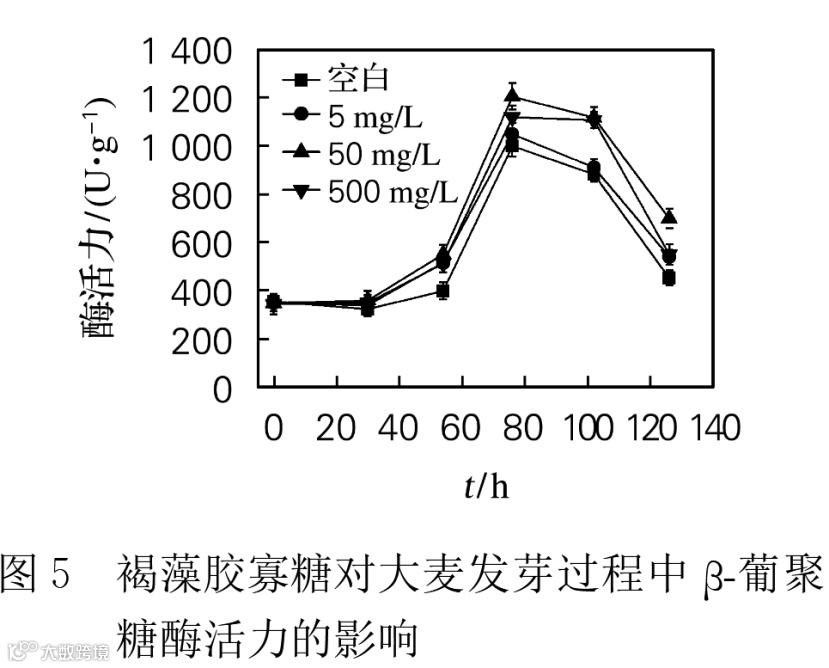 图5为在浸麦过程中添加不同质量浓度的褐藻胶寡糖对大麦β-葡聚糖酶活力变化的影响。结果表明,添加褐藻胶寡糖处理大麦和对照组β-葡聚糖活力都先保持不变,然后迅速升高,最后逐渐下降,在发芽74h时,大麦β-葡聚糖活力达到最高。