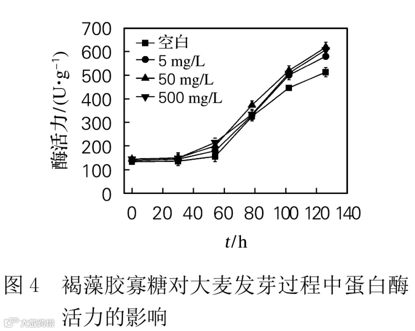 图4为在浸麦过程中添加不同浓度的褐藻胶寡糖对大麦蛋白酶活力变化的影响。结果表明,添加褐藻胶寡糖处理大麦和对照的蛋白酶活力都呈现出先稳定不变后迅速升高的变化趋势,在发芽结束时(126h),蛋白酶活力均达到最高。