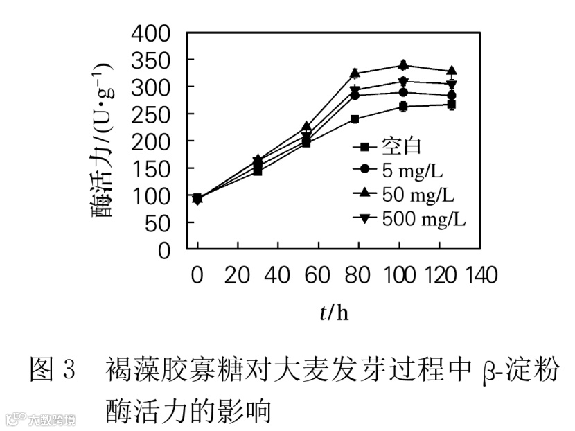 图3为在浸麦过程中添加不同质量浓度的褐藻胶寡糖对大麦β-淀粉酶活力变化的影响。结果表明,随着发芽进行,添加褐藻胶寡糖的大麦和对照组的β-淀粉酶活力均逐渐增加。