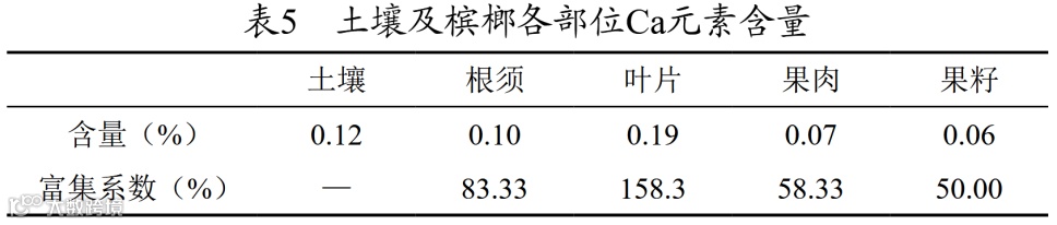 结果表明,槟榔各部位对Ca元素的吸收能力依次为:叶片>根须>果肉>果籽。叶片中的Ca含量大于土壤,说明槟榔叶片能通过自身吸收转换Ca元素。