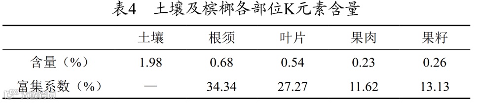 结果表明,槟榔各部位对K元素的吸收能力依次为:根须>叶片>果籽>果肉。