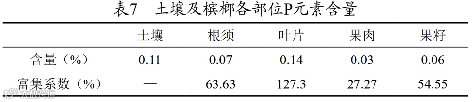 通过上述实验方法对槟榔园土壤及槟榔样品的分析测定,得出P元素的含量并计算富集系数,见表7。