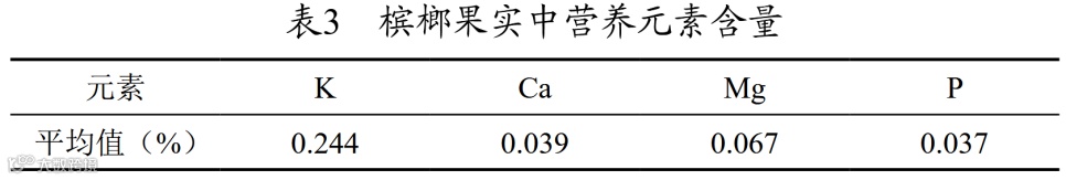 本研究通过对槟榔园中20株成龄槟榔树果实K、Ca、Mg、P元素的分析测试,并统计其平均值结果见表3。