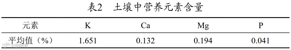 本研究对槟榔园20个土壤样品中K、Ca、Mg、P元素分析测试,并统计其平均值结果见表2。