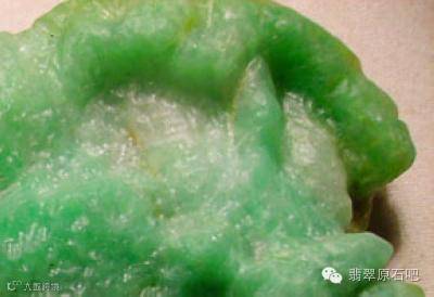 暴松花:是一种典型的次生松花,多出现在场口不正的块体上。颜色极其鲜绿。十分诱人,欺骗性极大。暴松花只生在表层,水干、质软、堆积较厚,没有可赌性。