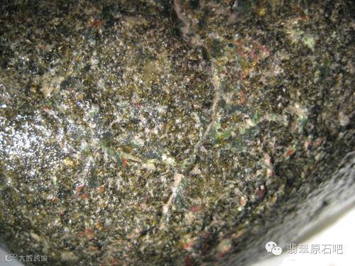 这块原石来说乌砂皮为颜色较深的黑色、绿色(见图 5),一般认为内部会有较深的绿色部分,甚至可出现满绿的翡翠,但是乌砂皮翡翠原石变化非常大,有的里面绿中带点、有的里面是很干的绿、有的里面的绿色差很大,还含有大量杂质。