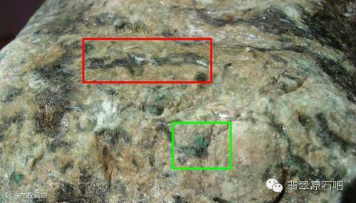 翡翠的蟒带大致分为两种,一种是对应构造转变的“种蟒”,另一种是对应颜色转变的“色蟒”。 众所周知事物的结构越紧密质地也就越好。所以在一块原石上好的质地(好的种)的部位抗风化才能更强,相同的外界前提下,其他局部被风化得下凹,而质地好的局部倒显得凸出来,便形成了“种蟒”。用手触摸翡翠的皮,“种蟒”会分明呈条带状凸起,并有一定的走向。从而来判断原石的优劣。 同理在风化过程中,无色、浅色翡翠对应的粗粒松散构造,相比绿色部分所对应的细粒构造的抗风能力要弱,很自然的在多年风化后绿色部分就会凸出来,构成“色蟒”。还有一种状况,翡翠颜色集中的带状区域能够含有一定闪石或绿辉石,这两种矿物的抗风化才能均弱于无色的硬玉,因而有颜色的带状区域反而凹陷下去。“色蟒”普通平行绿色的走向,绿的走向或称绿的外形,大多为原生裂隙中充填了富含铬离子的物质所致。