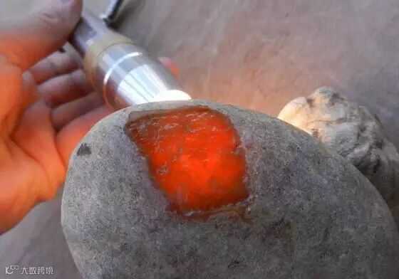 最好判断的就是薄水皮的翡翠原石(见图 1)。经过数万年河水的冲刷,原石表面的皮壳已经被几乎磨没了,通过强光照射内部情况一目了然。正如图中所示,原石表皮面光滑,厚度极低,证明内部矿物组成成分较纯,质地较好。
