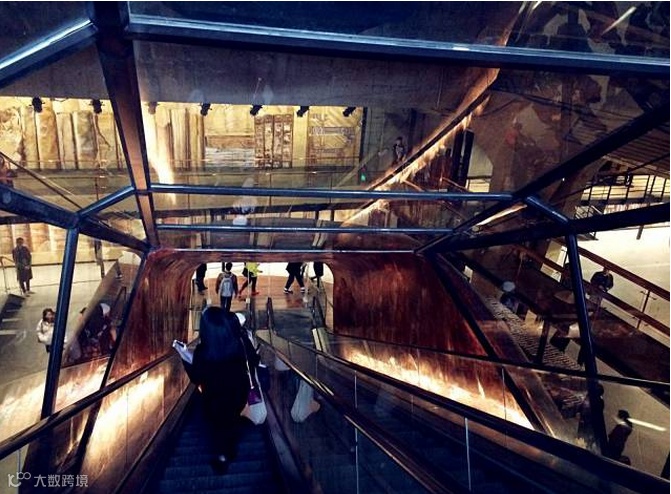 毛继鸿坚持在中部电梯出口打造一个以“时光穿梭机”为概念的雕塑。这是一个看上去金黄色,又变幻出五光十色的红铜焊接雕塑,重达十六吨,包裹着电梯与方所相连接的出口区域。铜身经过从内而外的捶打磨光,再经由药水擦磨与灼烧,散发出低调而神秘的光泽。当顾客在电梯下降的过程中,越是接近方所,越能感受到雕塑表面如凤凰羽毛般变幻的色彩,又如《星际穿越》中时光隧道的诡谲光晕。