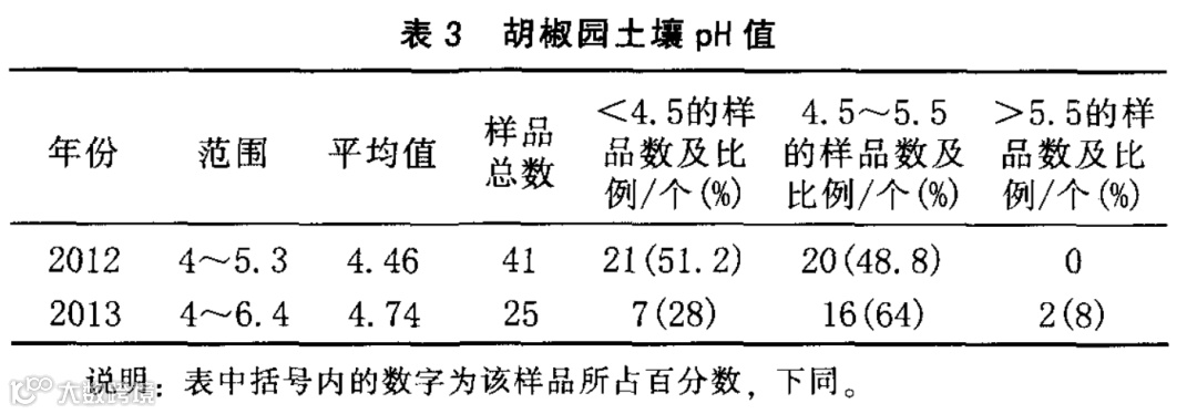 文昌胡椒园土壤pH值明显偏低,应加强和重视对土壤酸性调节的措施,根据当地情况采取生石灰或者其他有效的方法调节土壤酸碱度。