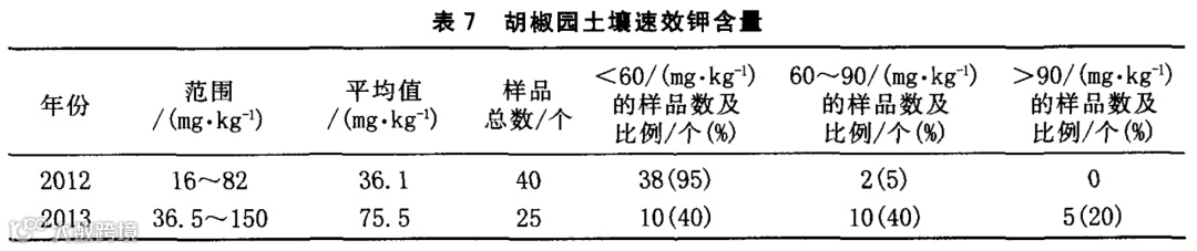 从表7可见,海南文昌胡椒园土壤速效钾含量较低,2012年和2013年变幅分别为16~82和36.5~150mg/kg,有95%和40%的土壤样品速效钾含量处于缺乏状态。