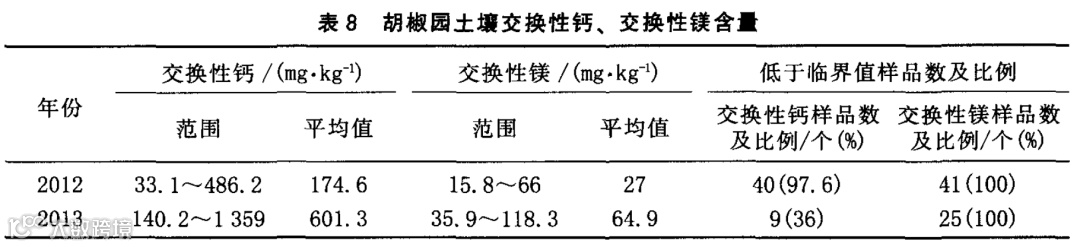 从表8可见,2012年和2013年海南文昌胡椒园土壤交换性钙含量变幅为33.1~486.2和140.2~1359mg/kg,其中低于临界值的样品数量分别占97.6%和36%,说明海南文昌胡椒园土壤交换性钙含量较低:交换性镁含量变幅分别为15.8~66和35.9~118.3mg/kg,低于临界值的样品数百分率为100%,说明海南文昌胡椒园土壤交换性镁含量严重缺乏。