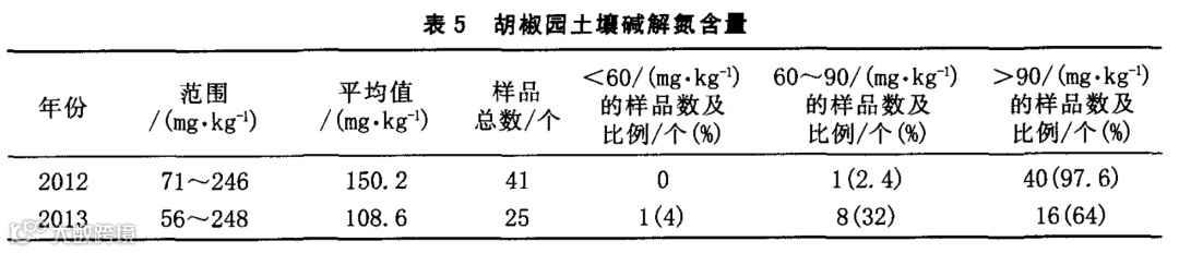从表5可见,2012年和2013年海南文昌胡椒园碱解氮含量变幅分别为71~246和56~248mg/kg,其中2012和2013年达到适宜和丰富的样品数量分别为100%和96%,只有2013年的土壤样品中4%处于缺乏状况,说明海南文昌胡椒园土壤碱解氮含量较高。