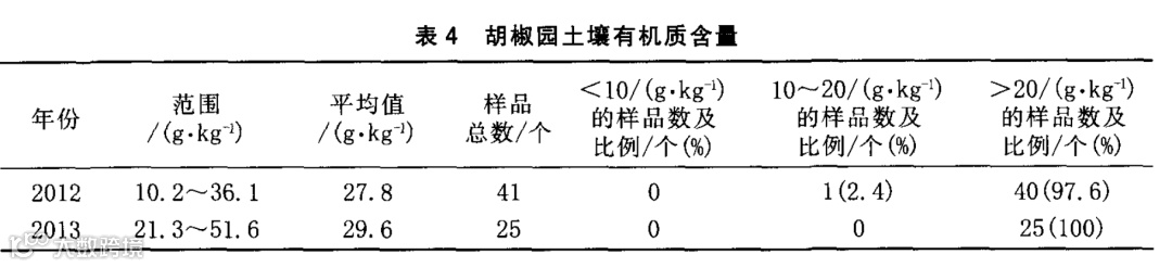从表4可见,2012年和2013年海南文昌胡椒园土壤有机质变幅分别为10.2~36.1和21.3~51.6g/kg,平均值分别为27.8和29.6g/kg。2012和2013年分别有97.6%和100%的土壤有机质含量达到丰富水平,有机质含量较丰富,所采集的土壤样品中未发现有机质缺乏的现象。