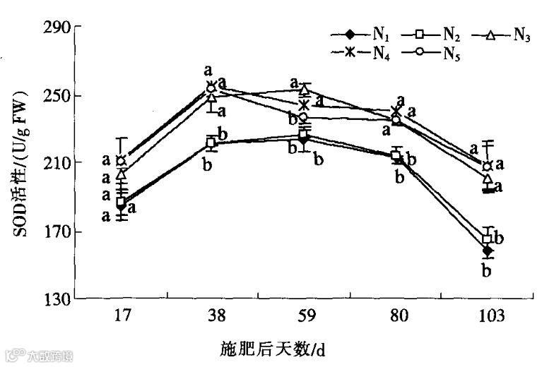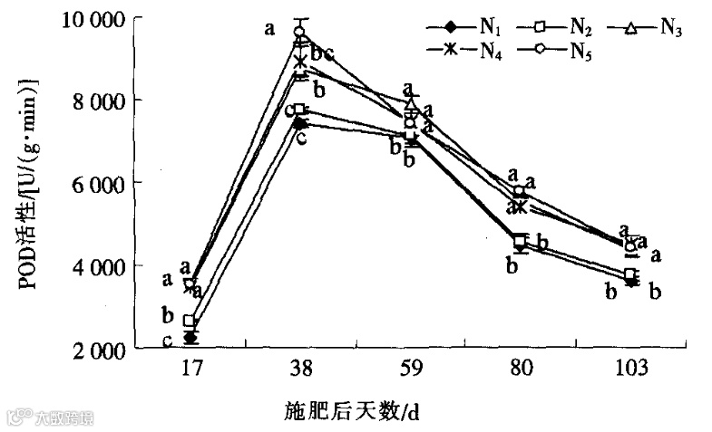 施肥后17d,不同施氮量处理间叶片SOD活性并无显著性差异:但N3、N4和N5处理中叶片POD活性均显著高于N1和N2处理中叶片POD活性,并且持续到整个生育期结束。施肥后38d,不同施氮量处理间叶片SOD活性才出现显著性差异,且N3、N4和N5处理均显著高于N1和N2处理,而N3、N4和N5处理间并无显著性差异。