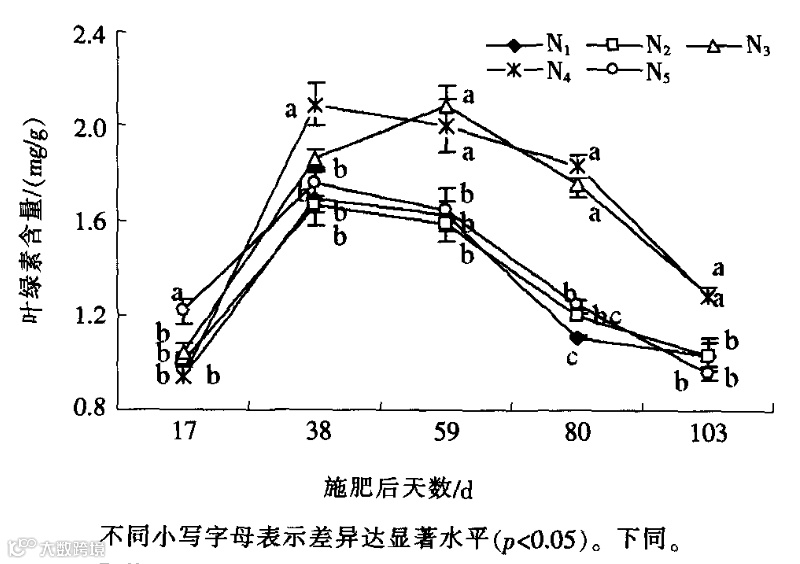 说明在一定范围内随着施氮量增加可提高胡椒叶片叶绿素含量,但施氮量过高,叶绿素含量反而下降。