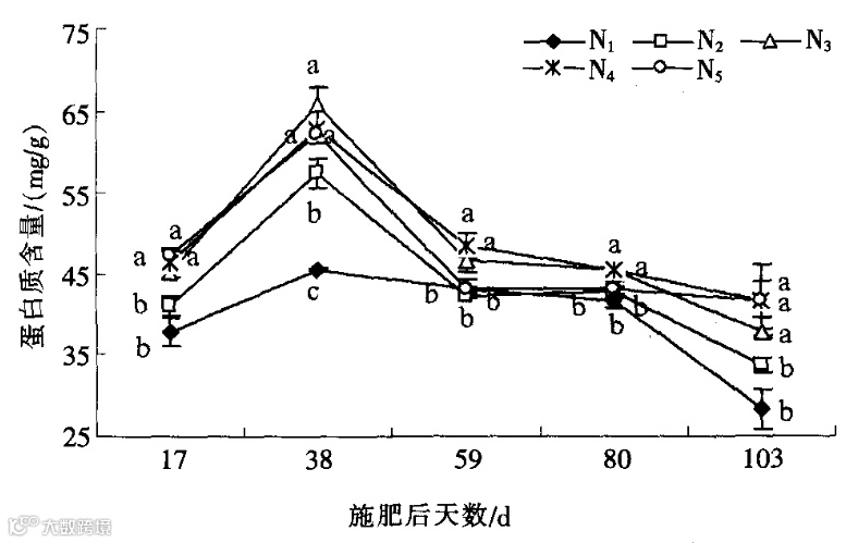 图2显示,胡椒叶片蛋白质含量随生育期的推进,呈先上升后逐渐下降趋势,但不同施氮量处理间存在一定差异。在施肥后17d和38d,N3、N4和N5处理均显著高于N1和N2处理,且N3、N4和处理间无显著性差异。但施肥后59d,N5处理蛋白质含量迅速下降,并显著低于N3和N4处理。在生长后期(施肥后103d),N1和N2处理蛋白质含量下降较快,显著低于其他处理。