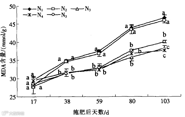 由图5可以看出,随着生育期的推进,不同施氮量处理叶片MDA(丙二醛)含量变化均呈上升趋势。不同施氮量处理间在施肥后17 d无显著性差异;在施肥38d后,N1和N2处理MDA含量迅速上升,显著高于N3、N4和N5处理,N3、N4和N5处理在施肥后38~80d叶片MDA含量均无显著性差异:在施肥后103d,N5处理叶片MDA含量显著高于N3和 N 处理。