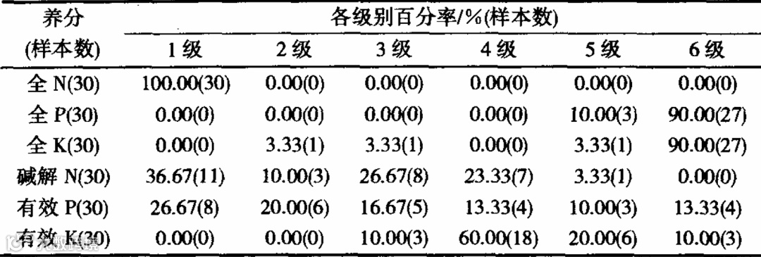 土壤碱解N较丰富,仅3.33%的土壤样品碱解N偏低(31~60mg/kg);10.00%13.33%的土壤样品有效P分别处于5级(3~5mg/kg)和6级(≤3mg/kg);30.00%的土壤样品有效K处于5级以下(≤50mg/kg)。