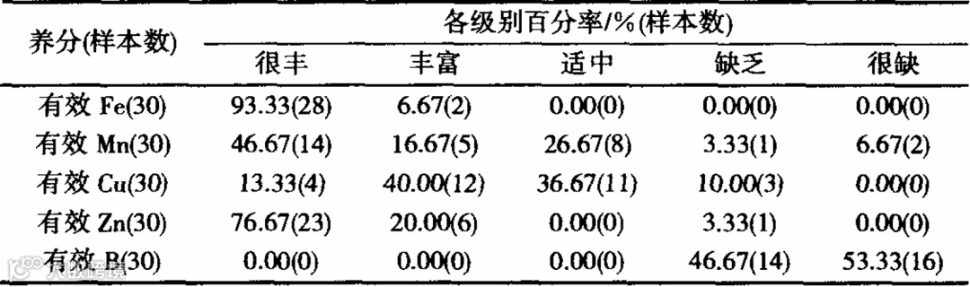 调查土壤中有效Fe、Zn较丰富,有效B较缺乏。经分析有效Fe、Zn处于很丰的土壤样品分别占93.33%和76.67%;有效Mn、Cu适中与丰富的土壤样品居多,但处于低水平(缺乏+很缺)的土壤样品仍各占10.00%(表4)。