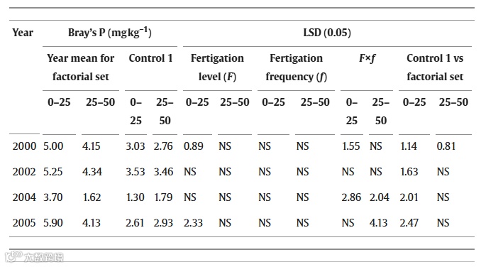 在25-50cm深度间隔处,有效P含量与0-25cm深度间隔的趋势相似。从图4有效磷含量在所有年份都保持不变(4.13–4.34mg/kg),除2004年在这两个土壤深度区间,2004年的速效磷显著低于其他年份。2004年有效磷的减少很可能是由于从2002年开始连续几年获得更高的作物产量。