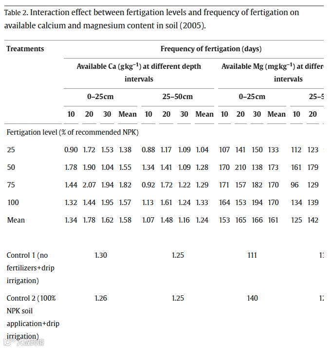 在0–25cm深度间隔处,与25%NPK(133毫克千克)相比50%、75%和100%NPK施肥处理的速效镁含量显著增加(170–173mg/kg),尽管施肥水平和频率之间的相互作用很大,但没有观察到明确的趋势。在25-50cm深度间隔处,只有施肥水平在有效镁方面显示出显着变化,没有明确的趋势。这可以归因于灌溉水对土壤中Mg添加的贡献。