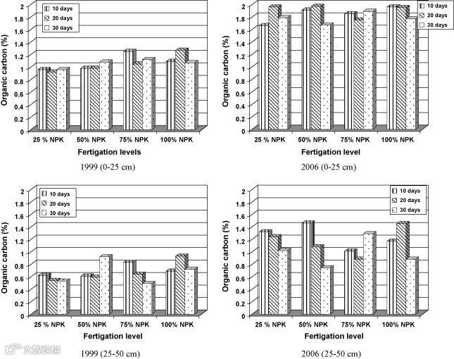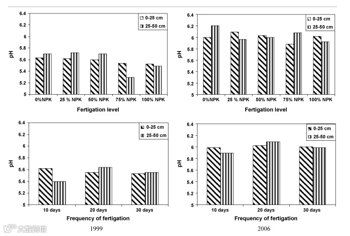 滴灌施肥对10年实验期间土壤pH值有显著影响(图2)在0-25cm深度区间内,1996年试验开始前的土壤pH值为5.6,1999年保持不变。土壤pH值在2006年实验结束时增加到6.0。1999年和2006年土壤pH值因施肥水平和频率而没有显著变化,而1999年它们在0-25cm深度间隔下的交互作用显著。因子处理组和对照1在2006年记录了相同的土壤pH值(6.0)。因此,可以推断槟榔根际土壤pH值的变化不是由于养分的添加,而灌溉水是土壤pH值变化的主要来源。