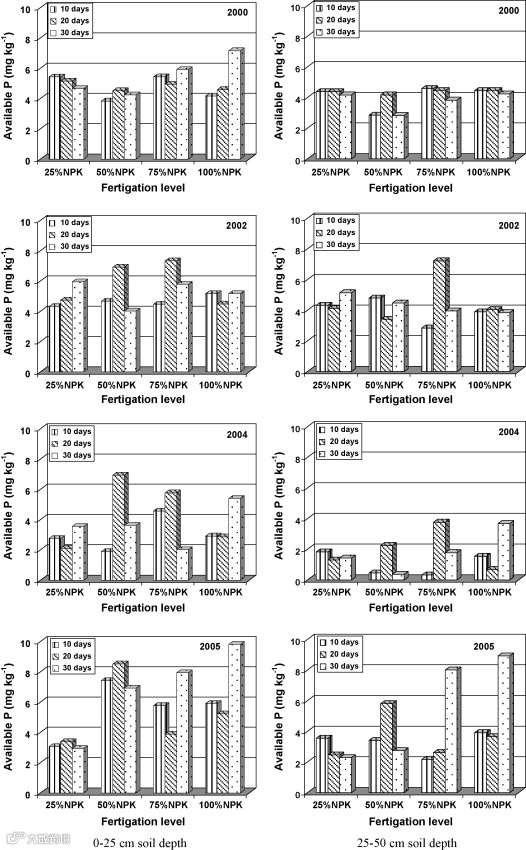 在0-25厘米深度间隔,2005年平均P含量明显更高(5.90mg/kg)比其他年份高,将施肥剂量从50%增加到100%NPK并未导致磷含量显着增加,保持在5.24至5.32mg/kg的范围内(表1),在施肥频率中,间隔30天显著提高了速效磷含量(5.32mg/kg)在根际超过10天间隔(4.49mg/kg)。