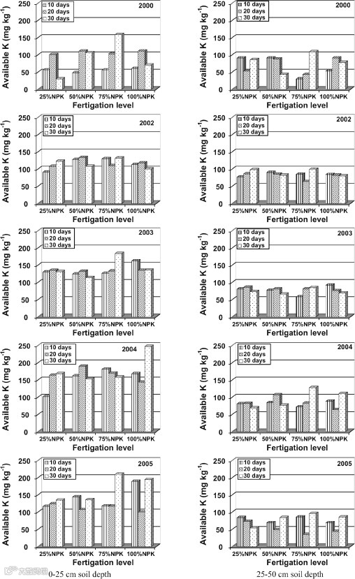 对2000年至2005年5年数据的汇总分析显示,施肥水平和频率及其相互作用对有效钾含量的显着影响(表1),由于槟榔根际(图5)试验期间钾含量逐渐增加,达到峰值167mg/kg;然后下降到141mg/kg。
