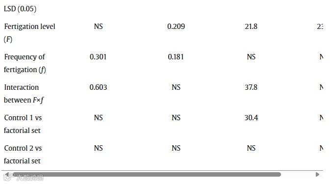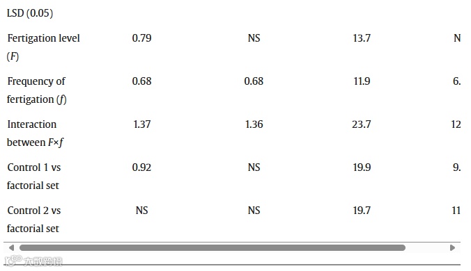随着施肥频率从10-20天的间隔增加,有效钙从1.34g/kg显著增加到1.78g/kg,而它保持在1.62g/kg间隔30天。在25-50cm深度间隔处,由于施肥频率的不同,有效Ca显着变化:有效Ca随着施肥频率的增加而增加。在两个土壤深度区间,析因组处理中的有效Ca含量与对照1和对照2相当。