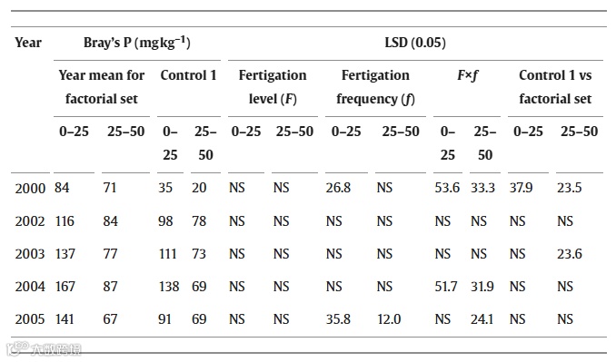 在两个土壤深度区间,有效P含量的年变化如下所示图4,2000年和2005年施肥水平对土壤速效磷有显著影响,而施肥频率没有显著变化。2000年和2004年施肥水平和频率之间的交互作用显著。除2005年外,析因组在所有年份均显著优于对照1。