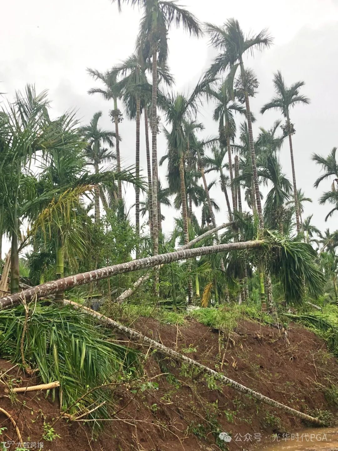 台风“摩羯”过后,海南槟榔树遭受重创,种植户损失惨重,为了帮助槟榔种植户尽快恢复生产,针对槟榔树的倒伏、叶片损伤、果实脱落等问题,提出以下关键的养护措施: